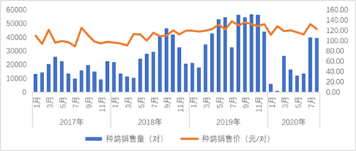一、种鸽价格高位下调 11月份,监测企业种鸽平均售价为113元/对,环比下跌5.8%,同比增加15.3%。同期,监测企业种鸽销售量下降到4.2万对,连续两个月下滑。个别地区种鸽场