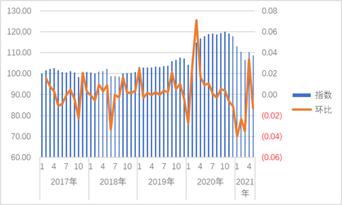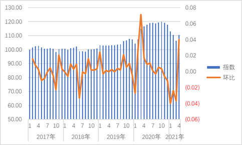 产能再次下调 5月份,监测企业种鸽存栏指数为105.74,环比下跌约1%,这个降幅从近四年看并不大。从同比看,本月产能指数与2017-2019年相比仍比较高。从企业结构看,企业产能变