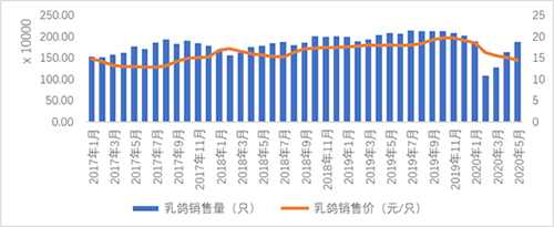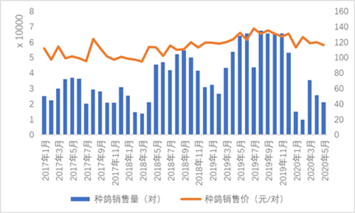 5月份,监测企业种鸽销量环比下降18%,而近年同期一般为增长阶段,表明市场的引种积极性仍有所下调。从结构上看,仅有极少数企业的销量有所回升,多数不销售或少销售。价格以下调为主,最低价格下调到34元/对,但高的有200元/对,这种价差主要是日龄的原因,由养殖场根据客户需要定制。总体来看,5月份种鸽销售量价齐跌。