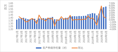 5月份,监测企业在产种鸽存栏量约为159万只,环比增长0.76%,增速放缓,但与近年同期相比,该增速依然表现最好。自2月份开始,产鸽产能因为多种原因已经连续增长了4个月。从结构上看,本月份监测企业产能未出现减产现象。