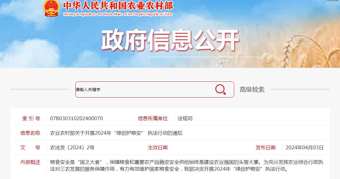 农业农村部关于开展2024年“绿剑护粮安” 执法行动的通知