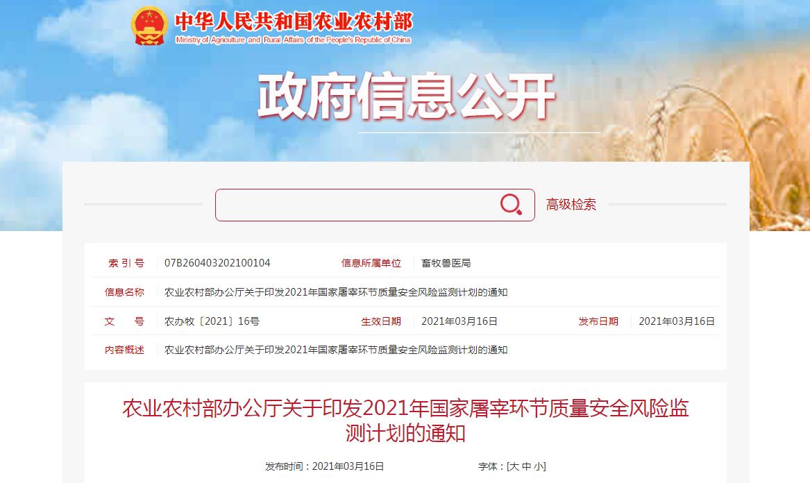 为保证畜产品质量安全,强化屠宰环节风险物质监测,农业农村部组织制定了2021年国家屠宰环节质量安全风险监测计划,并印发至各有关单位,要求认真组织开展工作?! ?021年国