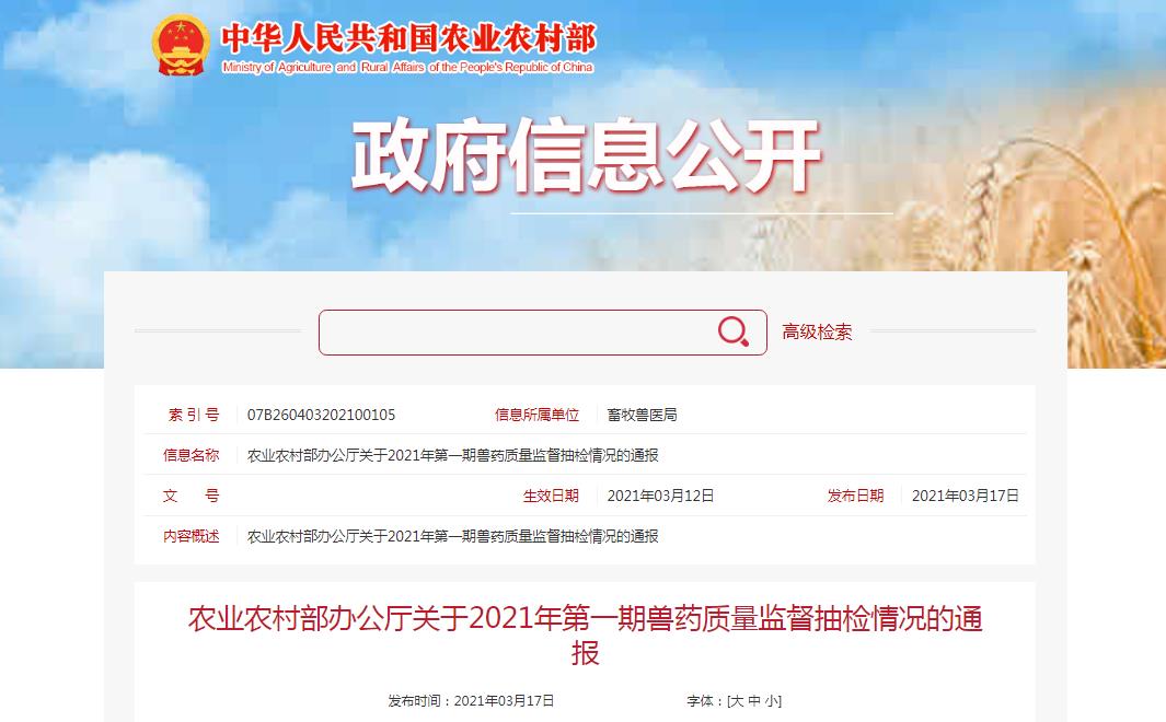 为加强兽药质量监管,保障养殖环节用药安全,根据全国兽药质量监督抽检计划,农业农村部组织对全国兽药生产、经营和使用单位进行了兽药质量监督抽检。现将有关情况通报如下