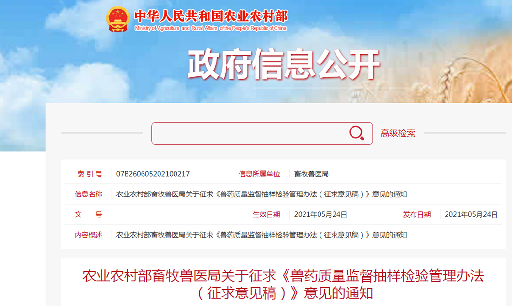 为进一步规范兽药质量监督抽样检验工作,我局组织修订了《兽药质量监督抽样规定》,形成《兽药质量监督抽样检验管理办法(征求意见稿)》,现面向社会公开征求意见,请于6月25日