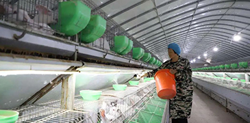 近日,在河北省邢台市广宗县核桃园镇小辛庄村,饲养人员正在给肉兔添加饲料?! 〗昀矗阕谙亟岷鲜谐⌒枨?,以产业发展为动力,采取“合作社+农户”的模式,带领农户