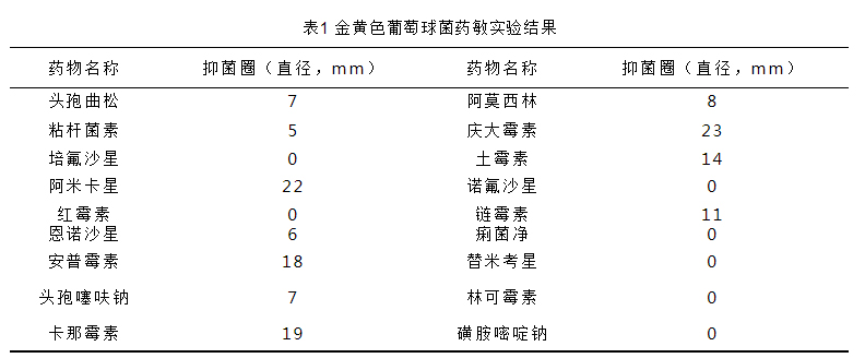 采用K-B试纸扩散法进行药敏试验。挑取纯培养后的单个菌落均匀划线于营养琼脂,用灭菌后的镊子夹取药敏纸片分别贴于平板表面,纸片间隔24 mm。经37 ℃恒温培养24 h后测量抑菌圈的直径,以标准质控菌株ATCC25922作参照,根据CLSI手册中的标准进行判断。18种抗菌药物进行药物敏感性试验结果,见表1。