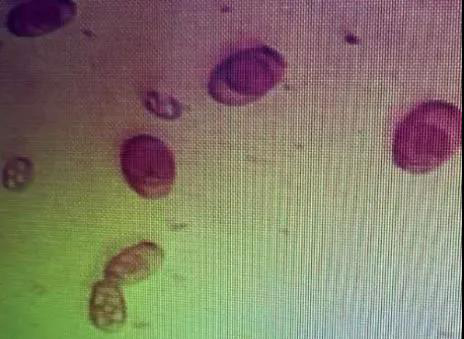 使用饱和盐水漂浮法检查病兔粪便和肠道内容物。取病兔粪便和肠道内容物,加入饱和生理盐水,通过双层纱布除去粪渣,将滤液分装在试管内,确保液面略微凸出于管口,静置10 min后使用干净的载玻片接触液面,加盖盖玻片后置于高倍显微镜下检查,可在视野内发现球虫卵囊(如图3)??杉言残吻虺媛涯?/span>