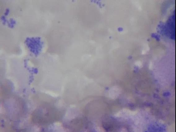 由图2可见,在视野中含有染色成为葡萄串样的紫色球菌。