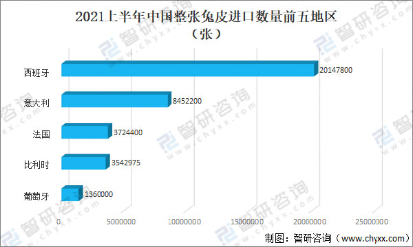 据中国海关数据,2021上半年中国整张兔皮从西班牙地区进口数量最多为20147800张,其次是从意大利地区进口整张兔皮进口数量为8452200张。
