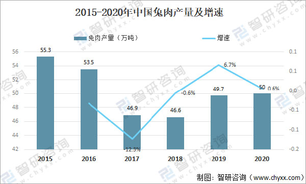 2015-2020年中国兔肉产量及增速