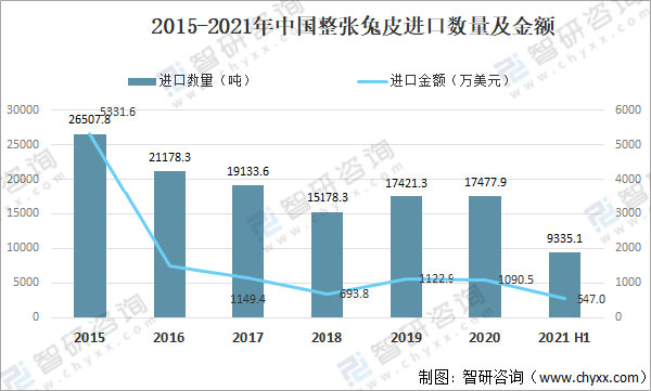 2015-2021年中国整张兔皮进口数量及金额