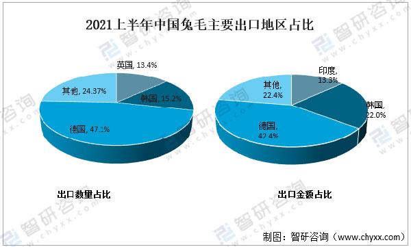 中国兔毛主要出口至德国、韩国及英国等地区,其中2021上半年中国兔毛出口至德国数量为36020千克,占总兔毛出口数量的47.1%。