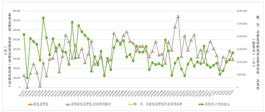 7月月度报告加入了2022年6月的海关进出口数据。6月份,出口的兔产品主要有家兔及野兔、其他家兔及野兔(改良种用除外)、兔肉、冻兔肉(不包括兔头)、未缝制整张兔皮、已梳兔毛、兔毛制针织钩编套头衫、开襟衫、外穿背心等;进口的兔产品主要是整张兔皮。以下为各单项进出口分析。