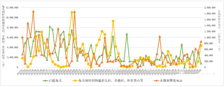 6月份整张兔皮进口额为291.82万元,较上月下降13.73%(图7)。