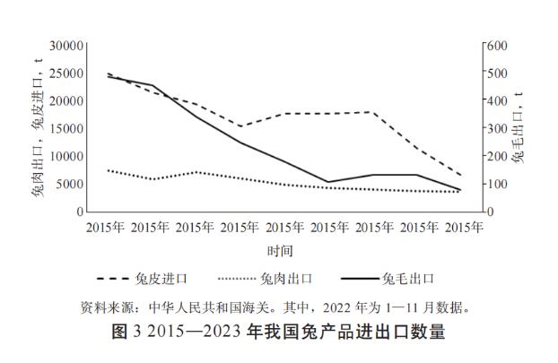 ?、弁闷?。以进口整张兔皮(HS编码43018010)为主, 同时出口少量未缝制整张兔皮(HS编码43021920)。近年来,我国整张兔皮进口连续大幅下降,2023年前11个月进口0.661万t,同比下降40%,降幅较大。2023年1—11月我国出口未缝制整张兔皮12.83t,同比下降51.12%(图 3)。