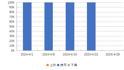 通过对中间环节集散地的价格进行监测,与2024年3月份相比,2024年4月份中除第四周数据缺失外,其余每一周的销售情况都为100%持平(见图3)。