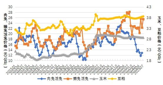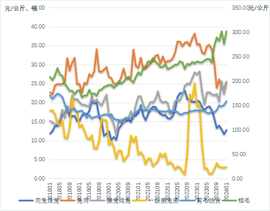 图2 2018年1月-2024年4月兔及兔产品价格走势(右坐标为兔毛价格)