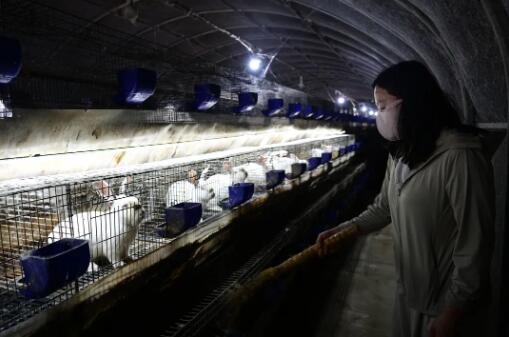 ↑在柏乡县柏乡镇东街村,养殖基地负责人正在给肉兔添加饲料。(张雪 摄)