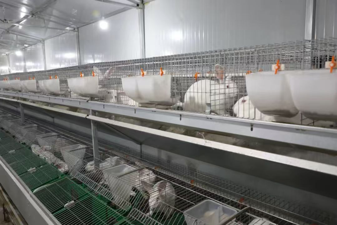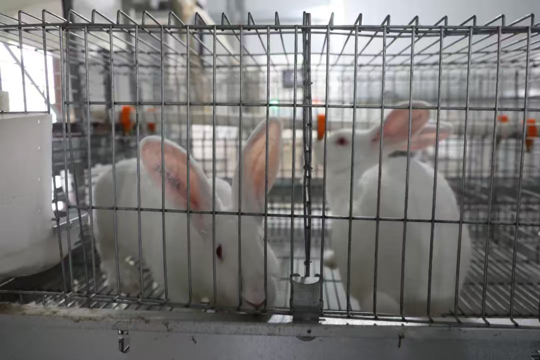 走进养殖基地,一排排整齐的兔舍映入眼帘。笼内一只只雪白的、毛茸茸的兔子圆滚可爱,有的在悠闲地进食,有的在眯眼打盹,有的兴奋地竖起耳朵四下张望,工作人员正熟练地加食、加水、清理粪便。