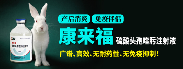 母兔输精/产后第一时间,注射[康来福]0.5ml/只,有效预防母兔产后炎症、仔兔“黄尿病”,提升母免受孕及产仔成活率;同时预防兔群因大肠杆菌、巴氏杆菌等病原菌引起的呼吸道疾病。