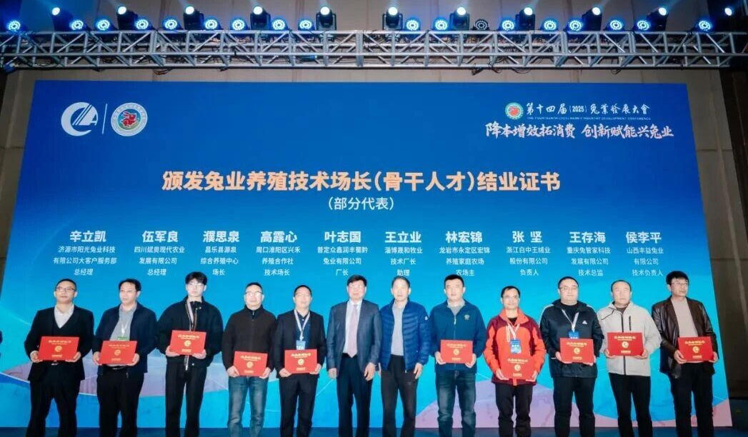 中国畜牧业协会沙玉圣秘书长、中国畜牧业协会兔业技术指导专家组长谷子林老师为兔业养殖技术场长(骨干人才)专项培训计划的优秀学员代表颁发结业证书。