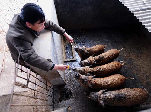 11月26日,工作人员在给野猪喂食。从2004年起,山西平陆县钰诚都特种野猪驯养有限公司采用“公司+基地+农户”的模式,带动当地980多农户饲养特种野猪2.2万余头,累计增收660余万元。这种特种野猪食量少,肉质好,是通过认证的“有机食品”。