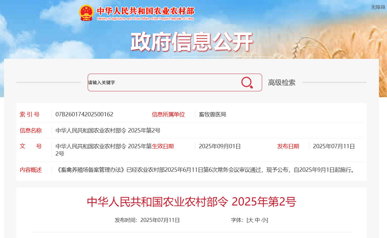 《畜禽养殖场备案管理办法》已经农业农村部2025年6月11日第6次常务会议审议通过,现予公布,自2025年9月1日起施行。