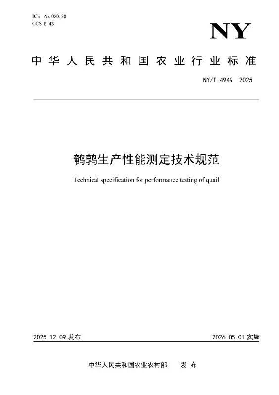根据农业农村部第976号公告,由江苏省家禽科学研究所质量安全学科团队牵头,联合中国农业科学院北京畜牧兽医研究所、湖北省农业科学院畜牧兽医研究所等单位制定的《鹌鹑生产性能测定技术规范》(NY/T 4949-2025)行业标准获批发布,并将于2026年5月1日起正式实施。