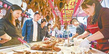 4月24日,荣昌区夏布小镇,荣昌卤鹅的人气爆棚,众多游客前来购买。记者 郑宇 摄/视觉重庆 5月4日,四川游客李利拎着两盒“荣昌卤鹅”,准备坐高铁回家。她的手机里