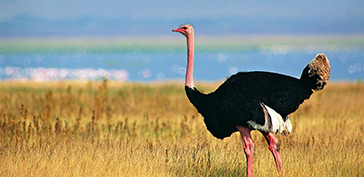 鸵鸟是群居,日行性走禽类,适应于沙漠荒原中生活,嗅听觉灵敏,善奔跑,为了采集那些在沙漠中稀少而分散的食物,鸵鸟是相当有效率的采食者,这都要归功于它们开阔的步伐、