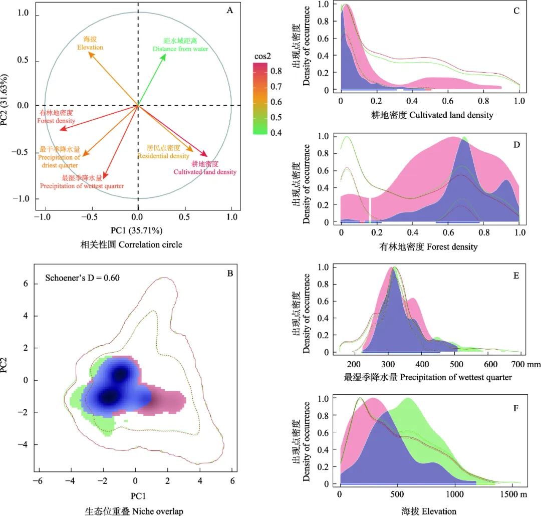 (2)水貂和水獭生态位存在高度重叠,Schoener’s D值达到0.60。单因子生态位分析结果表明,水獭比水貂对耕地密度更加敏感,集中分布在低耕地密度区;水獭和水貂均倾向选择有林地密度较高的区域,但水貂在有林地密度的选择上更加平滑,对森林的依赖程度比水獭低;水貂相比水獭更倾向选择降水量低的区域;水獭比水貂更倾向选择高海拔的栖息地。