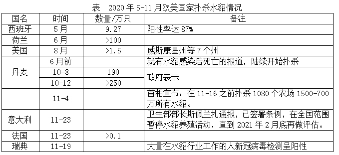 自2020年4月份,西班牙首先报道水貂集中感染新冠病毒和扑杀事件以来,荷兰等欧美其他国家也陆续开始报道,同时也报道了水貂感染人,导致人大量发生新冠病毒的事件。截至2020年11月底,世界卫生组织宣布7个国家水貂集中感染事件,并扑杀水貂。欧美国家扑杀水貂情况见表。